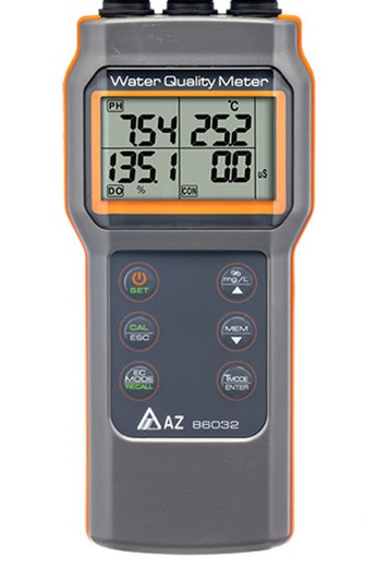 VZ86032VZ0 – портативний мультипараметричний вимірювальний блок AZ-86032 для швидкого та точного тестування різних параметрів води та розчинів: концентрації розчиненого кисню, рівня рН, електропровідності, загального вмісту розчинених твердих речовин (TDS), солоності і температури. Електроди та комірки для вимірювання необхідно купувати окремо!